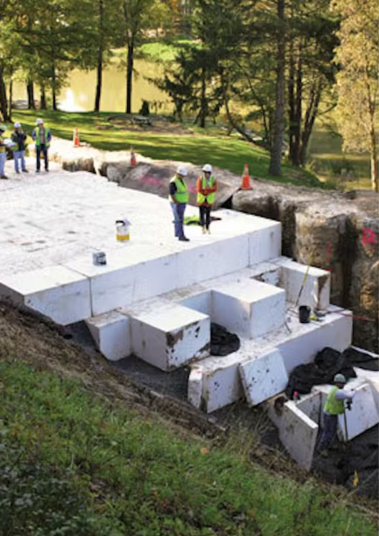 Large EPS blocks used in construction for lightweight fill, embankments, slope stabilization, and roadwork.